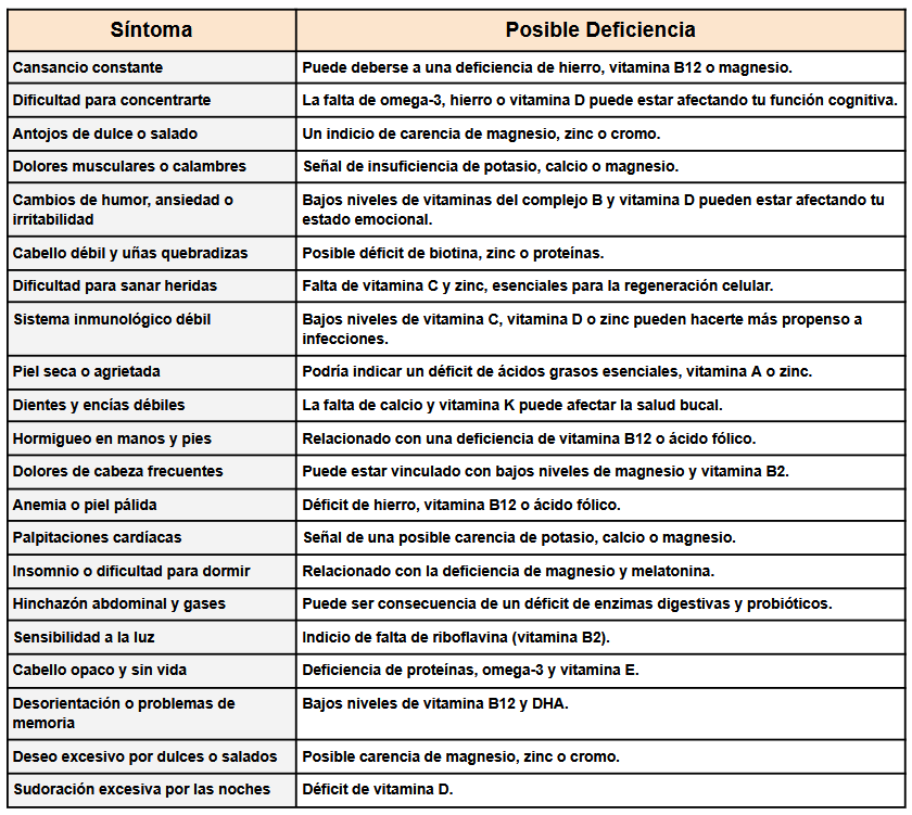 Esta lista es una guía general, pero cada cuerpo es único y responde de manera diferente a la falta de nutrientes. Si notas alguno de estos síntomas con frecuencia, no los ignores.
