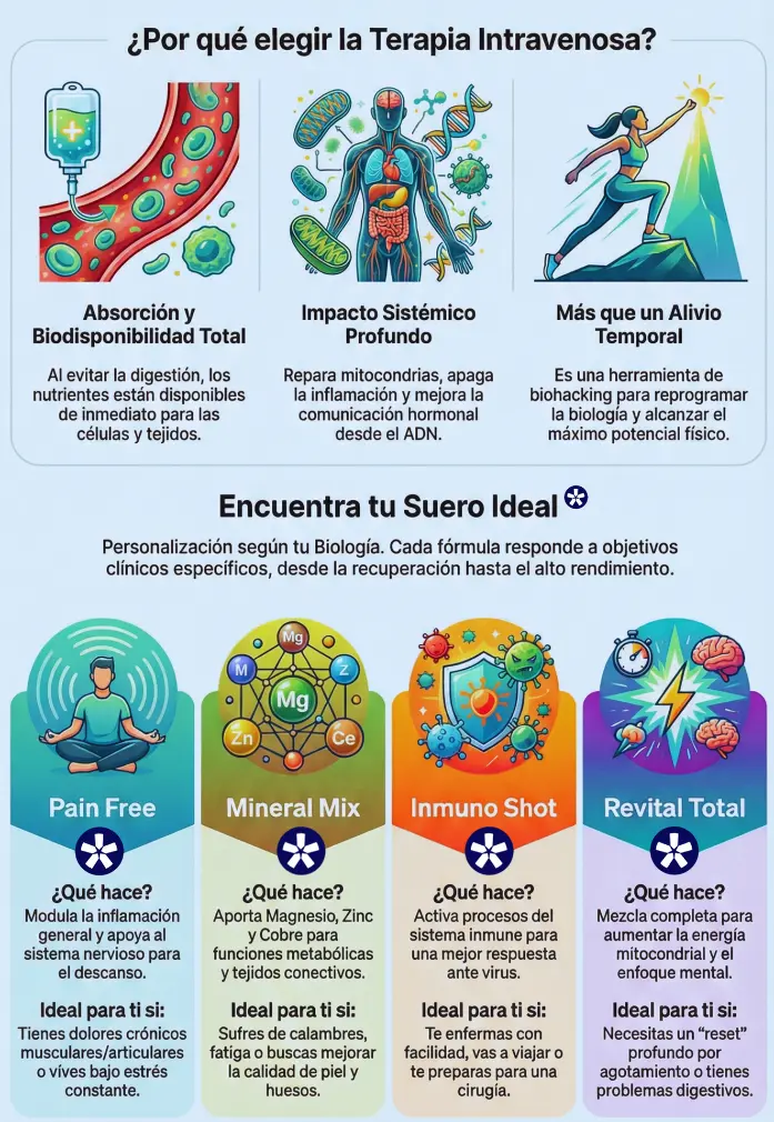 Los sueros de vitaminas y minerales son una herramienta estratégica dentro de ese enfoque sistémico. Son un impulso inteligente que facilita que el cuerpo haga lo que ya sabe hacer: autorregularse y sanar.